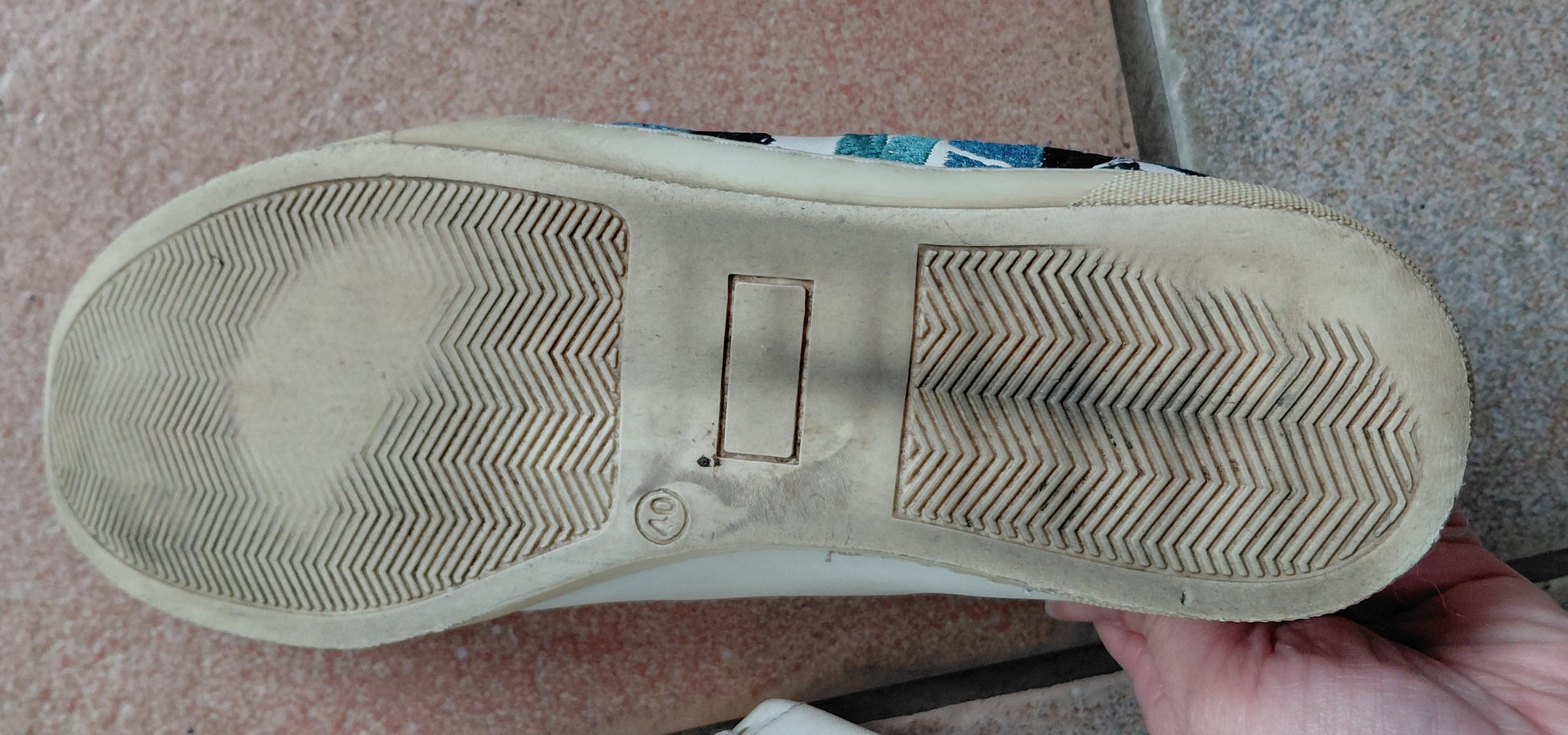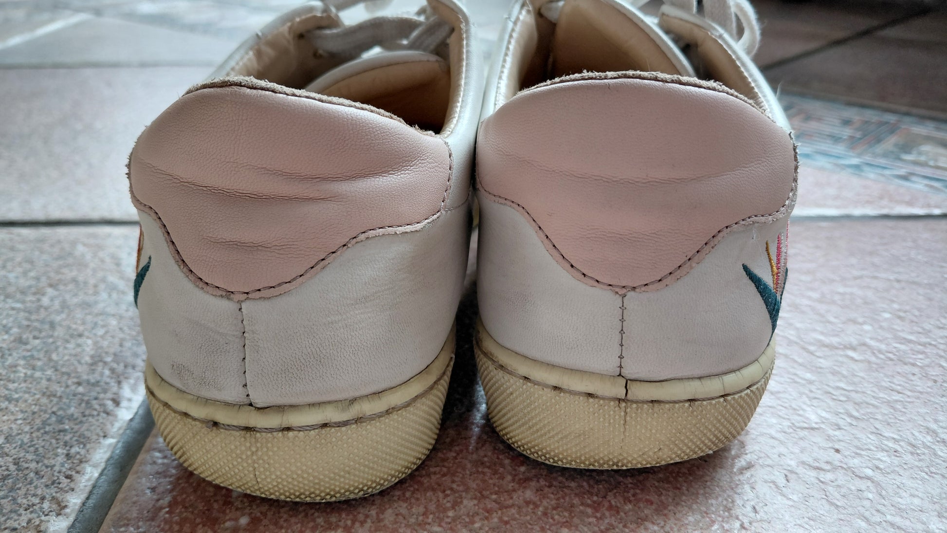 Baskets qui ont été portées avec présence d'usure visible sur les semelles, traces d'usure sur le cuir blanc, les semelles ont jaunies avec le temps. Fil de la broderie décousue sur un pétale d'une fleur.